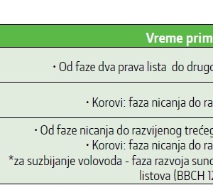 • Optimalno vreme tretiranja za dikotiledone korovske vrste koje niču iz semena je u fazi 2 – 4 lista, a za monokotiledone korovske vrsta koji niču iz semena je u fazi 1 – 3 lista